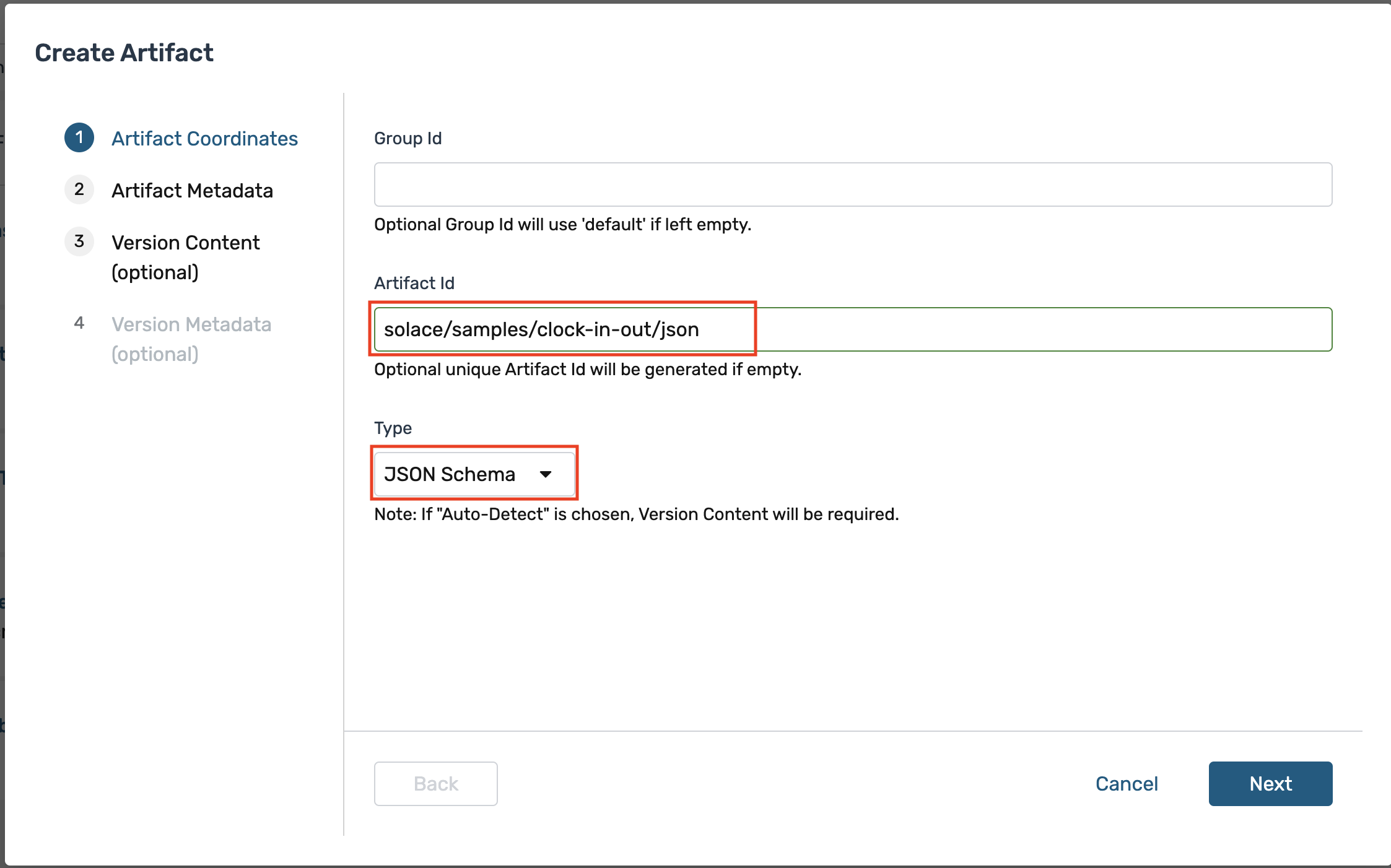 Create artifact button. Once the dialogue opens enter the following as shown below: solace/samples/clock-in-out/jsonJSON Schema